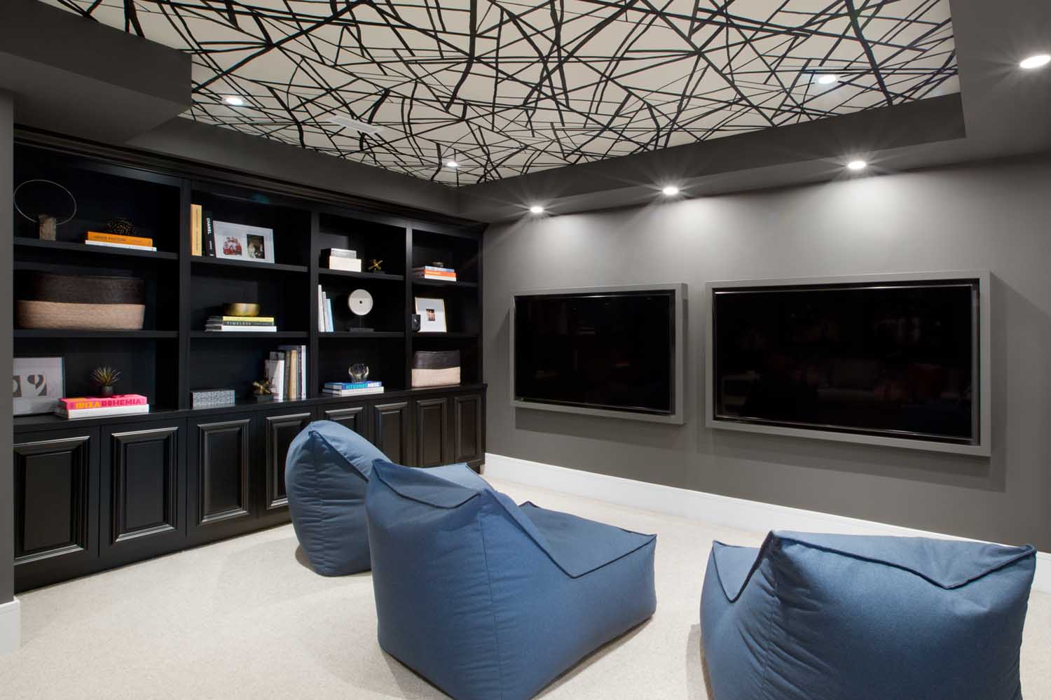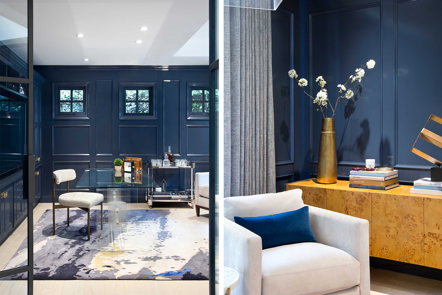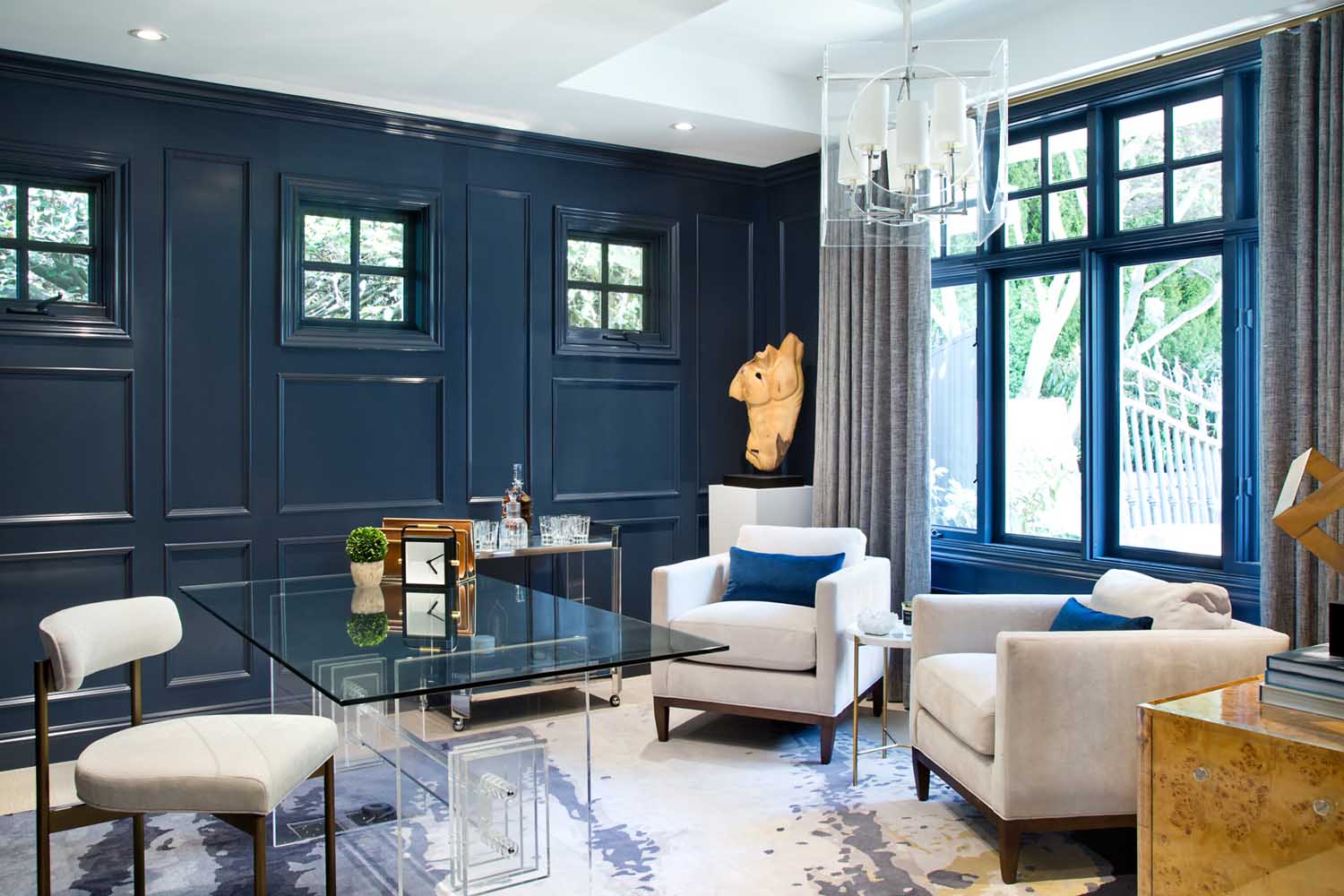 男主人希望有一個(gè)自己在家辦公會(huì )客的空間,因此我們?yōu)槟兄魅诉x擇了更加穩重的深藍色配色,讓整個(gè)空間更具備商務(wù)工作的場(chǎng)景。